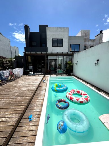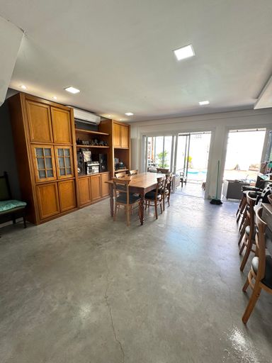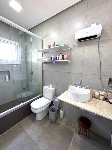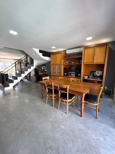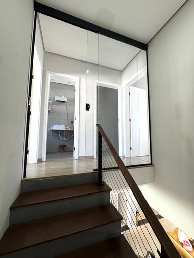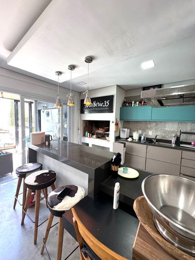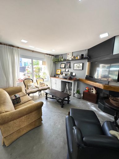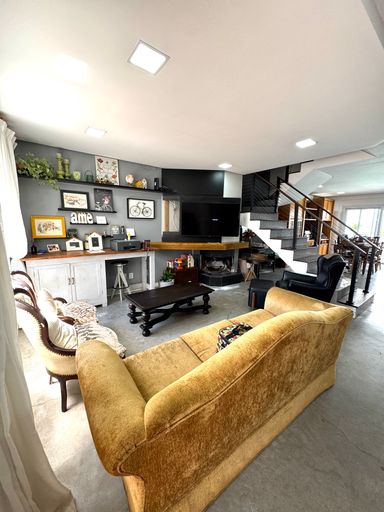 No pavimento térreo, os ambientes são pensados para o convívio e bem-estar: sala de estar aconchegante com lareira 🔥, lavabo, sala de jantar integrada à cozinha 🍽️ e também a um espaço gourmet com churrasqueira, ideal para reunir amigos e família. A casa ainda possui varanda fechada em vidro, além de uma agradável piscina com deck de madeira 🏊♂️, perfeita para aproveitar os dias de sol.