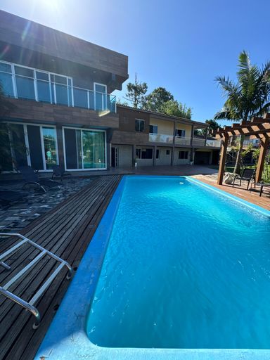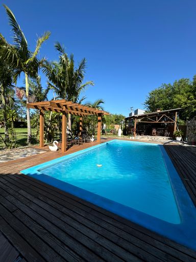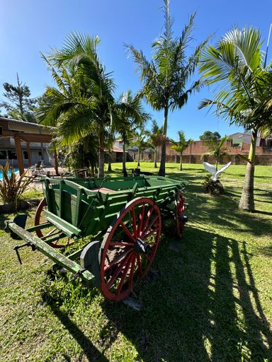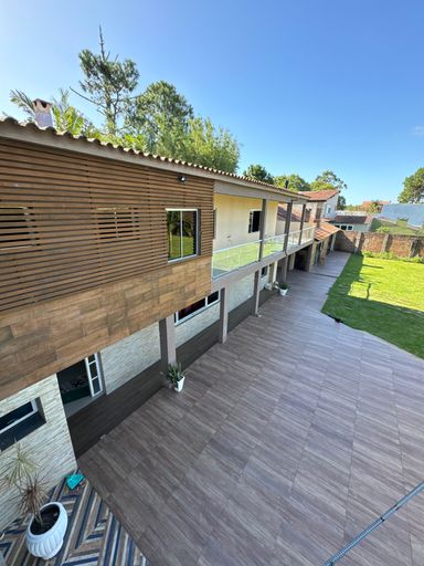 Aqui, o verde domina a paisagem. Há grandes gramados, árvores frutíferas, um piscinão convidativo, uma churrasqueira externa ao estilo tradicional, e até um fogo de chão para as noites frias e encontros ao redor das brasas — daquele jeito que só quem vive no Sul entende.